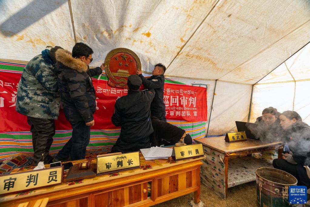 “正義雪蓮”女子審判團隊成員乘車來到距離石渠縣城70公里的呷依鄉(xiāng),準備通過巡回審判開庭審理一起離婚案。這是工作人員在當事人家的一頂帳篷中布置“帳篷法庭”(1月10日攝)。新華社記者 沈伯韓 攝