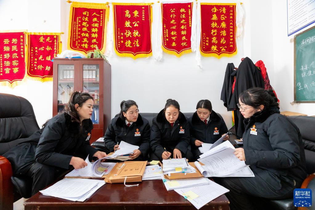 在石渠縣人民法院,法官澤仁曲西(右一)帶領“正義雪蓮”女子審判團隊成員查閱案卷,討論案情(1月11日攝)。新華社記者 沈伯韓 攝