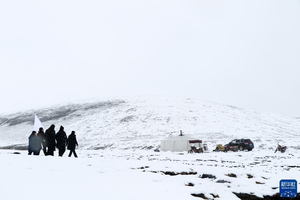 “正義雪蓮”女子審判團隊成員冒雪深入牧區(qū),為牧民提供法律服務(2021年5月16日攝)。新華社發(fā)