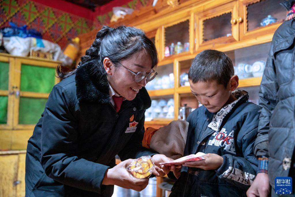 “正義雪蓮”女子審判團隊成員到一名當事人家中回訪,法官澤仁曲西(左)為當事人的孩子送上助學金(1月11日攝)。新華社記者 沈伯韓 攝