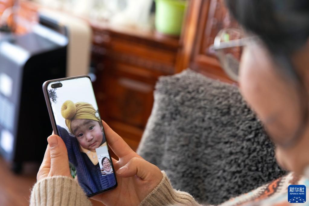 在石渠縣家中,法官澤仁曲西與遠在成都的兒子通過視頻電話交流(1月11日攝)。目前,澤仁曲西的兒子跟著外婆在成都,丈夫在300多公里外的德格縣工作,一家人分居三地,相聚時間寥寥。新華社記者 沈伯韓 攝