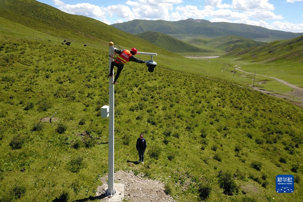 7月22日,在甘德縣生態(tài)畜牧業(yè)聯(lián)合社牦牛養(yǎng)殖基地,技術(shù)人員維護(hù)視頻監(jiān)控設(shè)備(無人機(jī)照片)。新華社記者 范培珅 攝
