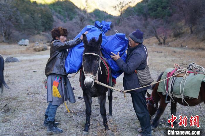 正值寒冬,丹增培楚牽著騾馬隊從香格里拉高原牧場的群山之間緩緩走來,馬幫的銅鈴發出叮叮當當的樂章。