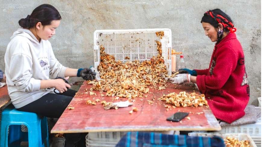 在園區挑選松茸的村民(央廣網發 中共雅江縣委宣傳部供圖)
