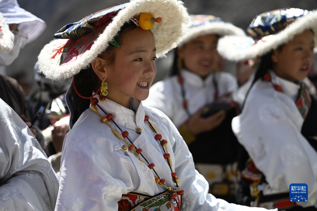 4月12日,小朋友在卓木齊村舉辦的糌粑節上欣賞歌舞表演。新華社記者 陳凱 攝