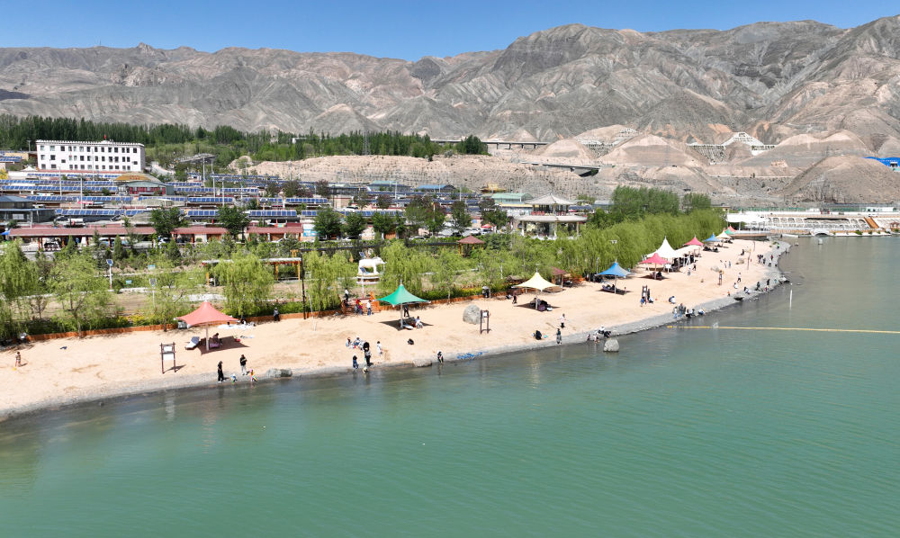 5月13日,游客在黃河上游尖扎段岸邊游玩(無人機照片)。新華社記者 張宏祥 攝