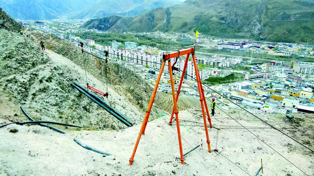 在北山片區,遠遠就能看見一道又一道“銀絲”架在空中,而黑色超長鋼管正“坐纜車”緩緩“劃”過。一根根長鋼管連接成了33.8千米水利灌溉主管網,其主干管全長約7.9千米,起于國慶水庫下游左岸預留閘室,終于扎西科自來水廠南側。南山片區干管,全長12.4千米,主干管和南山片區干管計劃今年6月投入試運行。北山片區干管,全長13.5千米,因山勢陡峭原因,計劃今年10月完工投入試運行。