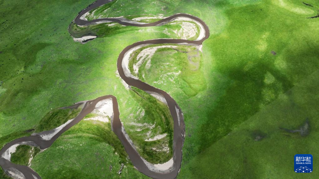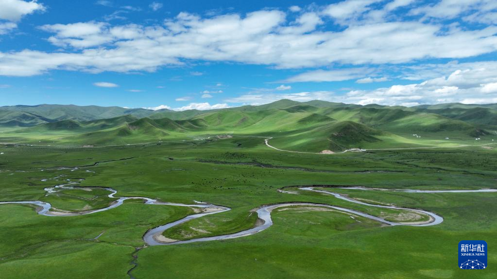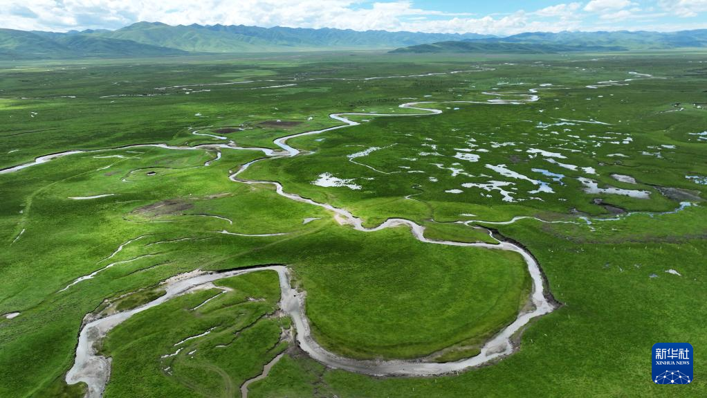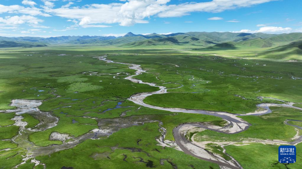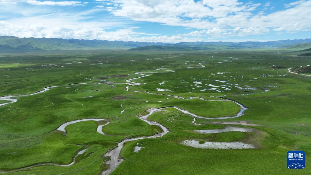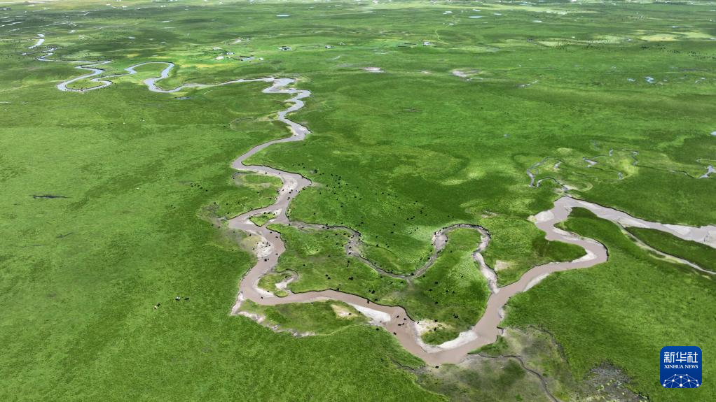 這是瑪曲縣河曲馬場的濕地草原景色(7月5日攝,無人機照片)。新華社記者 方欣 攝