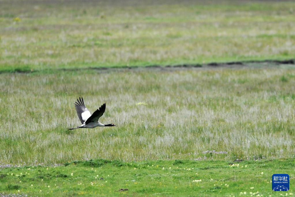 一只黑頸鶴在瑪曲的濕地草原上飛翔(7月6日攝)。新華社記者 陳斌 攝