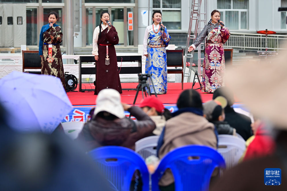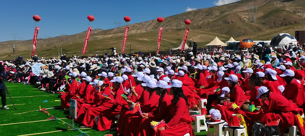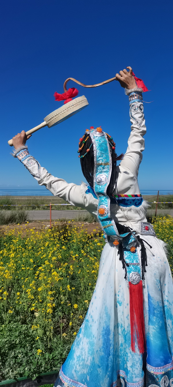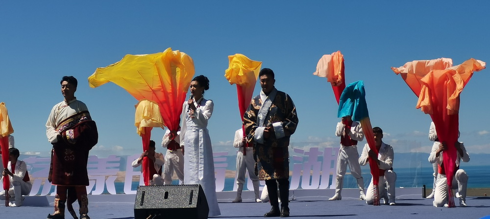 背靠同寶山,面朝青海湖,身著盛裝的當(dāng)?shù)馗髯迦罕姾褪苎钨e歡聚在鮮花盛開的金銀灘草原,在湖光山色中共享視聽盛宴。