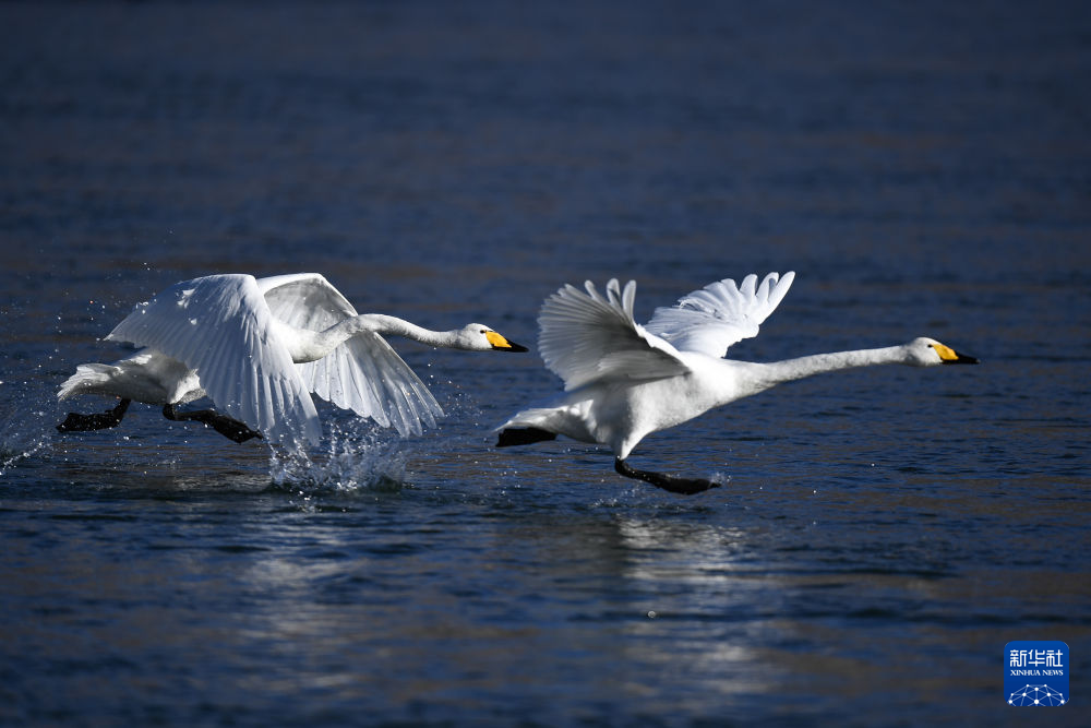 這是在青海省海南藏族自治州貴德縣境內的黃河濕地拍攝的天鵝(2021年12月24日攝)。新華社記者張龍 攝