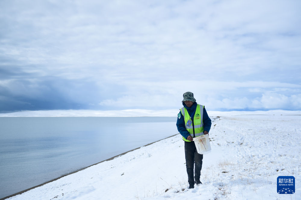 2021年10月20日,在青海省果洛藏族自治州瑪多縣扎陵湖鄉勒那村,三江源國家公園黃河源園區生態管護員在扎陵湖邊撿拾垃圾。新華社記者張龍 攝