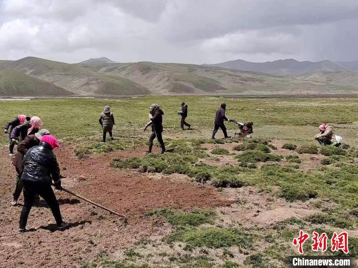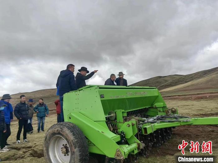 圖為官方檢查試驗田草種子發芽情況。果洛州瑪沁縣自然資源和林業草原局 供圖