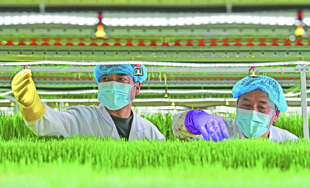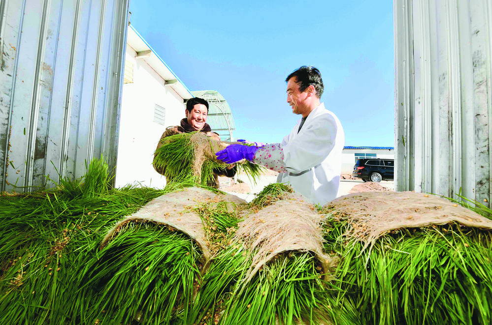 工作人員檢查牧草長勢情況