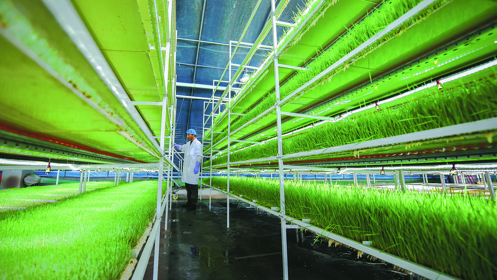 隨后,驅車來到位于海晏縣哈勒景蒙古族鄉哈勒景村的海北吉泰農牧業科技有限公司,牧草無土栽培試點項目建設大棚中溫暖如春,兩排種植架整齊地豎立兩旁,架子上綠油油的青稞牧草長勢喜人。據介紹,這些青稞牧草是無土栽培的,屬于芽苗類草類,可連根帶葉一起喂食牛羊,其中的蛋白質、維生素和淀粉含量較高,是名符其實的“營養餐”。