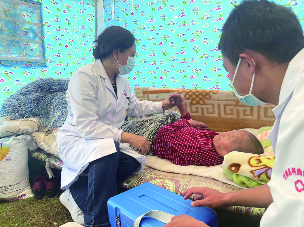 “哪里需要去哪兒,病人的事就是最大的事。”這是尼瑪拉毛經常重復的一句話。養(yǎng)老院的孤寡老人是她每次出診時重點巡查的人群,而老人們更把她看作是自己的女兒,生病了就托人帶話給她,她也總會及時去看望老人們。在她的從醫(yī)經歷中,遇到家庭困難的患者,差的藥費她總是悄悄地墊上。好多居住在牧區(qū)的老人,由于年齡高、腿腳不方便、長期臥病在床、交通不方便等原因,不能來縣城看病,她了解到這些患者的信息后,帶著他們需要的藥品和生活用品,親自上門服務,為他們解除病痛的折磨,給他們的生活增添了很多溫暖。一位78歲的老奶奶多年受老寒腿困擾,在接受治療后癥狀減輕,她激動地說:“我年輕的時候長得漂亮著呢,可就是不好意思在大家面前跳舞。后來不害羞了,腿疼得又跳不了舞。現(xiàn)在,我的腿不疼了,我要跳舞給你們看看。”歡樂的鍋莊音樂響起來了,尼瑪拉毛和老奶奶隨著音樂起舞,她們的眼里,都溢滿了淚花,是激動,也是彼此給予的溫暖……