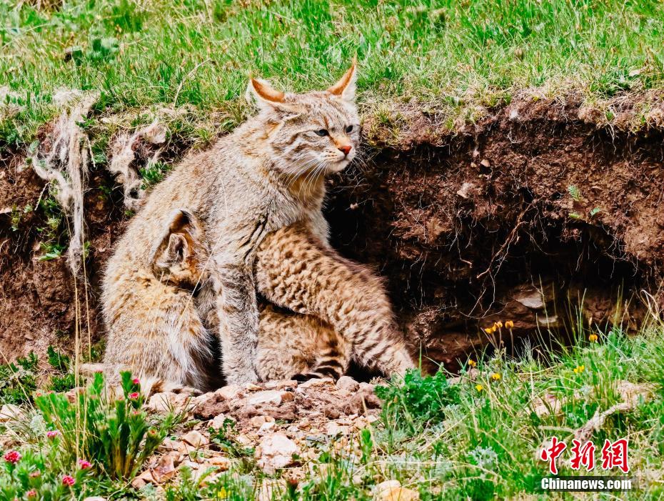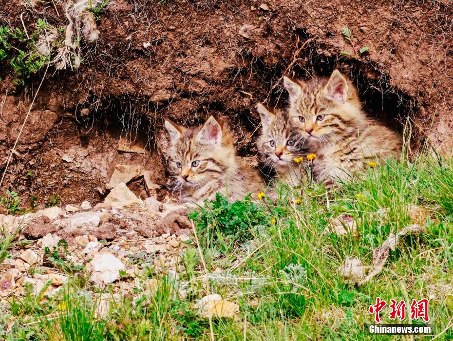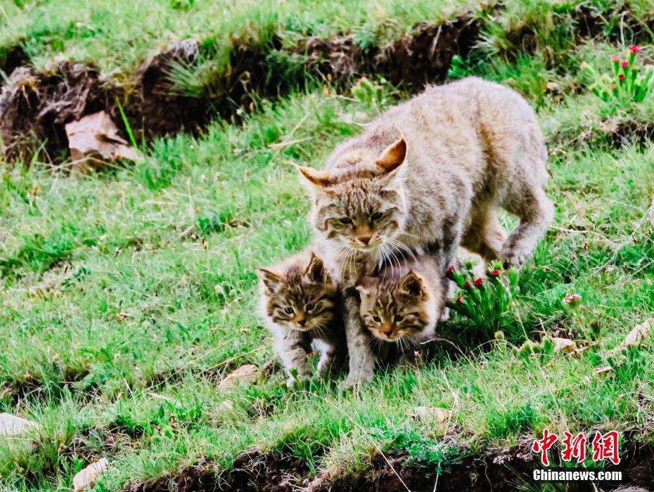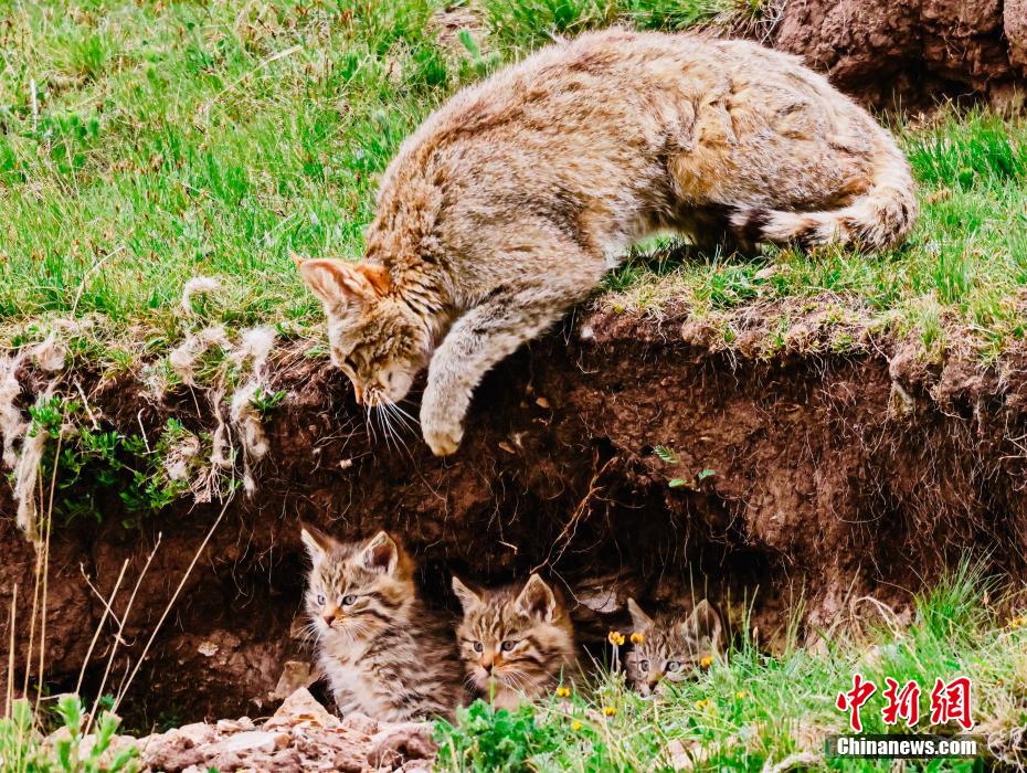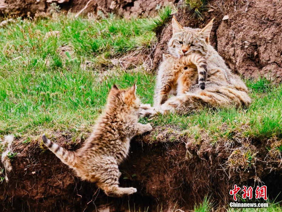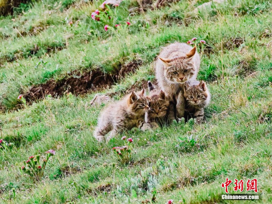 6月15日,盛夏時節,在青海省海北藏族自治州海晏縣哈勒景蒙古族鄉查庫太草原上,攝影愛好者拍攝到荒漠貓幼崽出窩“踏青”的畫面。畫面中,荒漠貓幼崽或是與媽媽嬉戲玩耍,或是“哥仨”追逐打鬧,或是練習捕獵技巧,甚是呆萌可愛?;哪埛植加谇嗖馗咴瓥|部,是中國特有的貓科動物,國家一級重點保護野生動物。