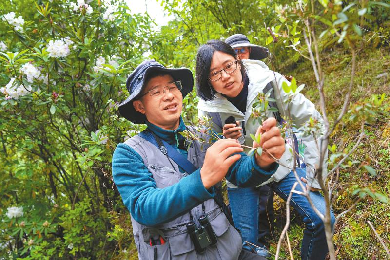 回到山腳,張遠(yuǎn)彬正在打開植物“盲盒”?!斑@里海拔差別大,杜鵑的種類特別多,這是以前沒有記錄到的?!睆堖h(yuǎn)彬直呼“驚喜”,邊用手機拍下形態(tài),邊口述特征讓一旁的助手記錄。
