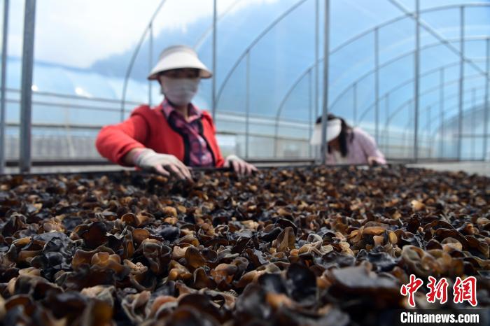 圖為工作人員在卓尼縣木耳鎮一食用菌種植大棚內晾曬采摘的黑木耳。中新社記者 九美旦增 攝
