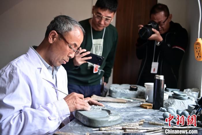 圖為華媒代表在卓尼縣采訪拍攝洮硯制作技藝。中新社記者 九美旦增 攝