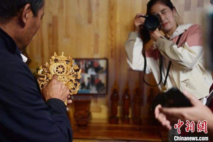 圖為華媒代表在卓尼縣采訪拍攝藏式木雕文化。中新社記者 九美旦增 攝