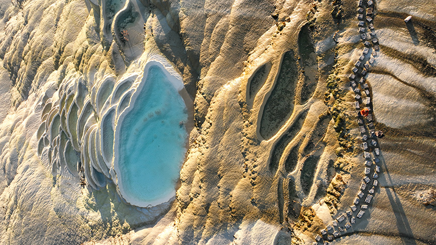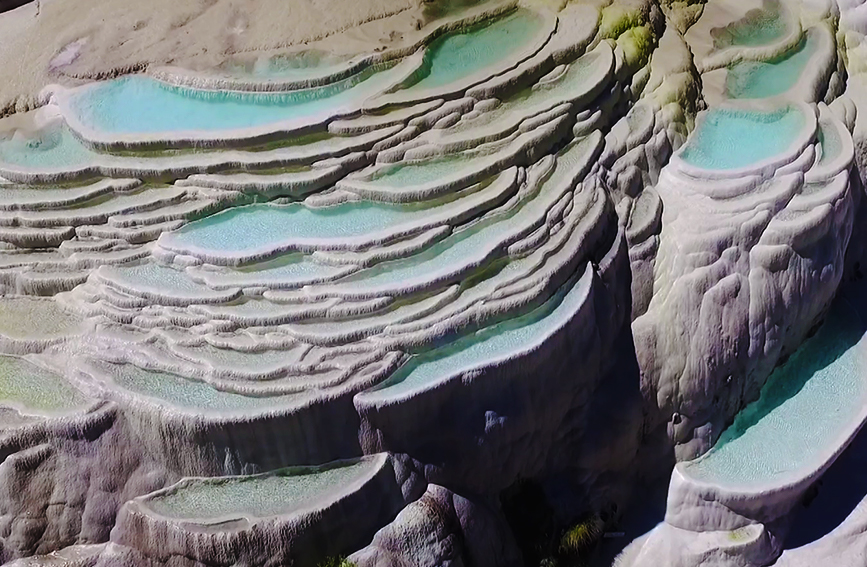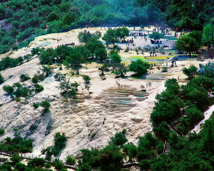 白水臺層層疊疊的鈣化池如白色梯田一樣。香格里拉融媒供圖