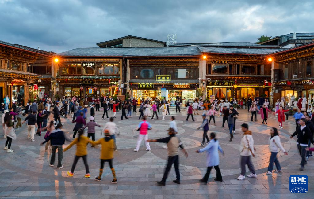 9月27日,游客和當地群眾在獨克宗古城里一起跳舞。新華社記者 王靜頤 攝