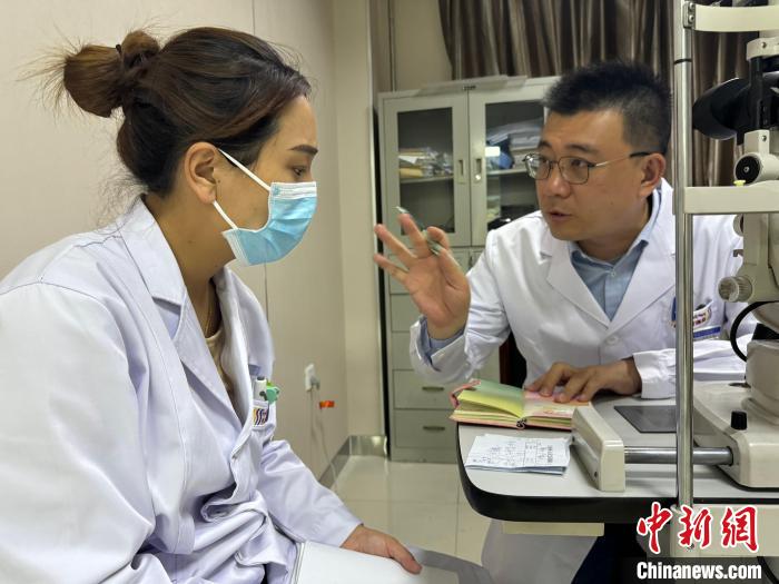 資料圖為顏繁誠(右)與玉樹州人民醫院眼科中心醫生交流。潘雨潔 攝