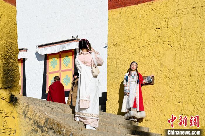 圖為游客在噶丹松贊林寺內穿民族服飾拍照。中新社記者 李嘉嫻 攝