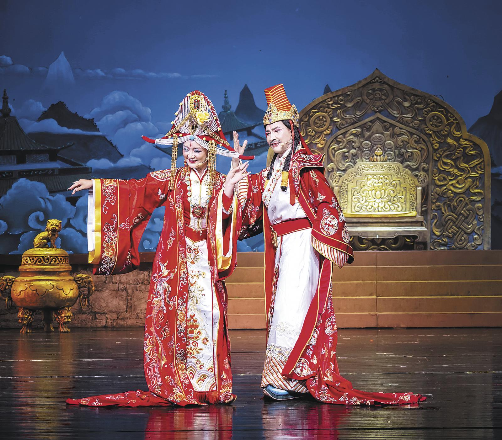 表演開始,藏戲獨特的唱腔響起,演員們身著華麗厚重、色彩斑斕的藏戲服飾登場。現場鼓撥聲交織,演員們的唱詞和念白抑揚頓挫,講述著金城公主為促進漢藏文化交流、促進民族團結做出的卓越貢獻。