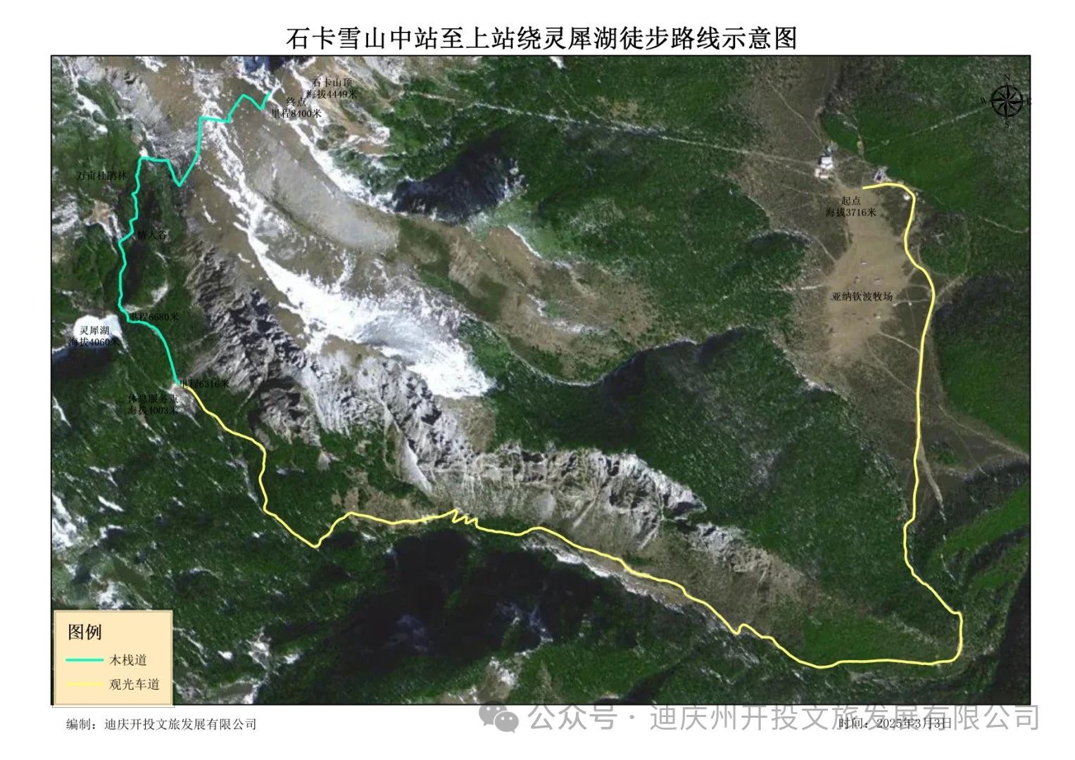 徒步線路為香市石卡雪山服務(wù)中心—乘纜車(chē)至亞納青波牧場(chǎng)(3785米)—靈犀湖(4051米)—萬(wàn)畝杜鵑林—石卡雪山山頂打卡點(diǎn)(4449米)—乘索道返回游客服務(wù)中心,累計(jì)爬升664米。