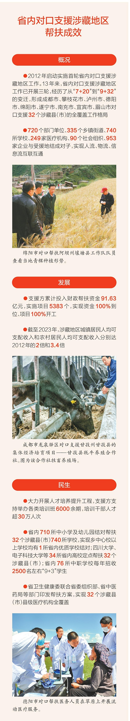 是分享,更是回眸。2012年,四川省內對口支援涉藏地區工作啟動。13年來,各支援市、省直部門、相關企業和商協會堅定落實省委決策部署,傾情傾力、精準幫扶,累計投入財政幫扶資金91.63億元,實施項目5383個,實現資金100%到位、項目100%開工,幫扶工作取得豐碩成果。