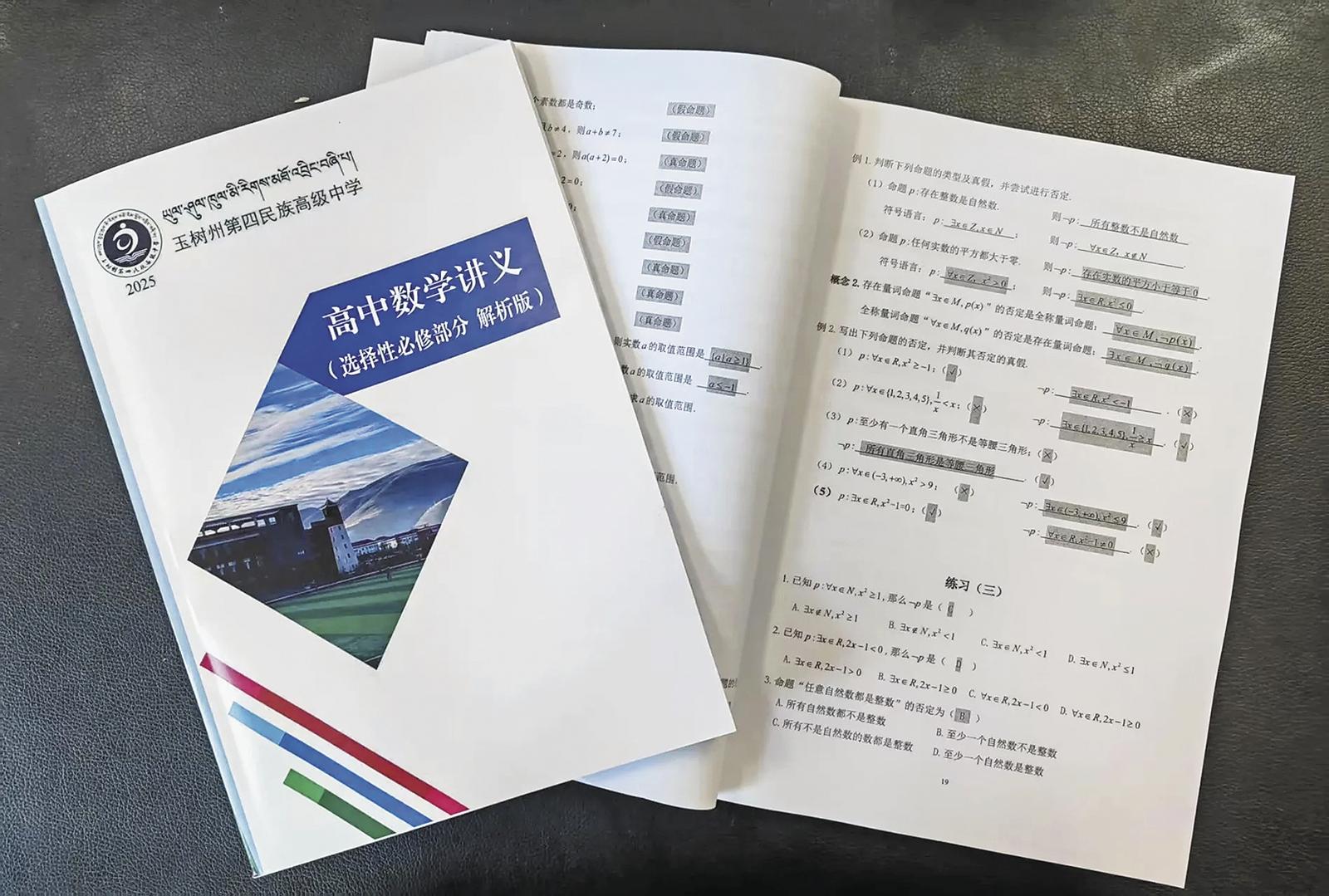 6月16日,在青海省玉樹藏族自治州第四民族高級中學高二7班的教室內(nèi),孩子們每個人手里拿著一本《高中數(shù)學講義(必修部分)解析版》認真翻看。