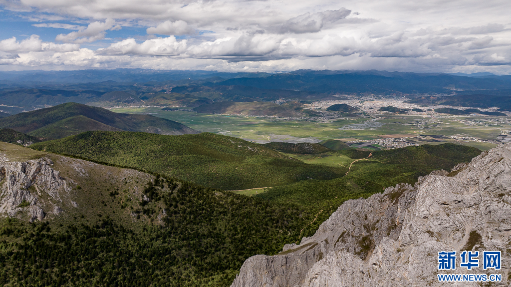 石卡雪山與遠處的納帕海、香格里拉市區(6月10日攝)。新華網 劉東 攝