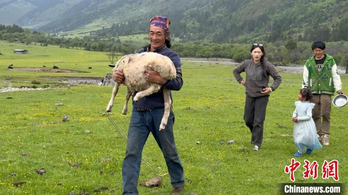 丹增培楚(左一)抱著準備宰殺的綿羊向牧屋走去。駱忠華 攝