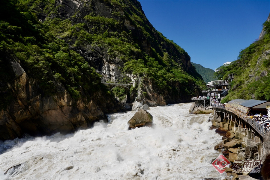 香格里拉虎跳峽作為國家4A級景區和全國十大最美峽谷之一,站在觀景臺上,游客就可以俯瞰到“虎跳石”的磅礴奇觀,以及哈巴雪山與玉龍雪山隔江對峙的壯麗景象。金沙江在峽谷中如怒龍咆哮,江心“虎跳石”清晰可見,這一傳說中的地標在此刻的壯闊景觀中,成為了大自然鬼斧神工的最佳注腳。