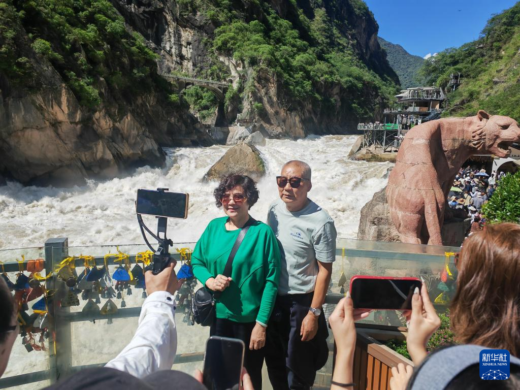 6月26日,游客在虎跳峽景區(qū)拍照留念。新華社記者 浦超 攝