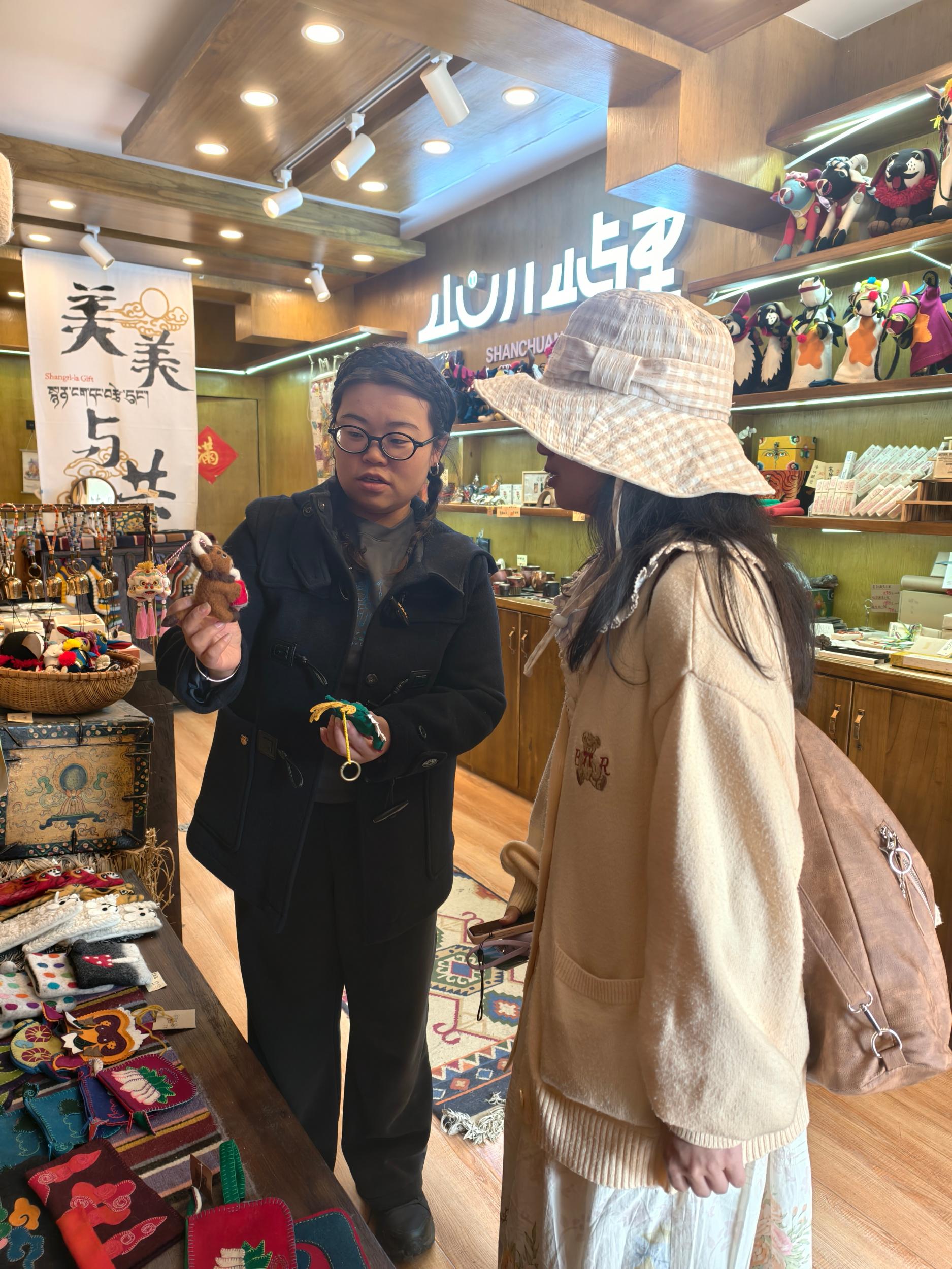 來自內蒙古的店主王煒茜2021年到香格里拉游玩后,便愛上了這座獨具民族風情的寧靜小城。她注意到一同游玩的朋友們買不到合適的、獨具香格里拉特色的紀念品,便有了親自開一家深耕于本地的文創品店的想法。