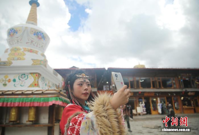 9月27日,一名身穿藏族服裝的游客在香格里拉獨克宗古城打卡。黃興鴻 攝