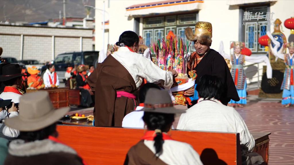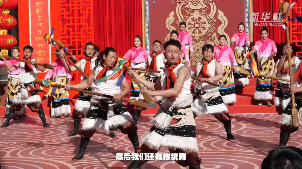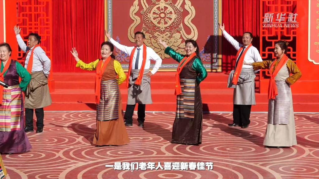 農歷癸卯兔年春節大年初一,西藏拉薩市娘熱街道吉蘇4組的村民們身著節日盛裝,在家門口觀看娘熱民間藝術團演繹的2023年西藏“啟航新征程 幸福中國年”村晚。
