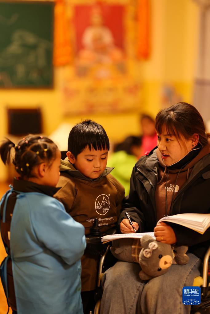卓嘎(右)在給藏文書法小學員講授書寫要點(12月1日攝)。新華社記者 姜帆 攝