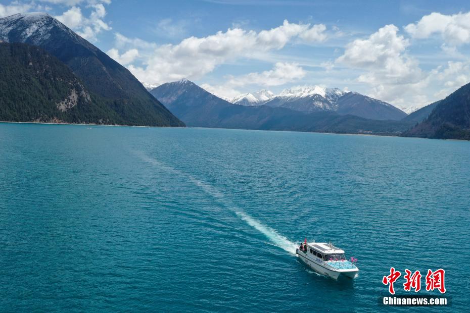 4月6日,西藏林芝工布江達縣巴松措景區游人如織。春日里,湛藍湖水與巍峨雪山相映成趣,游客游玩湖心島或乘船游覽,沉醉在這湖光山色中。圖為巴松措里的游船。中新社記者 貢嘎來松 攝