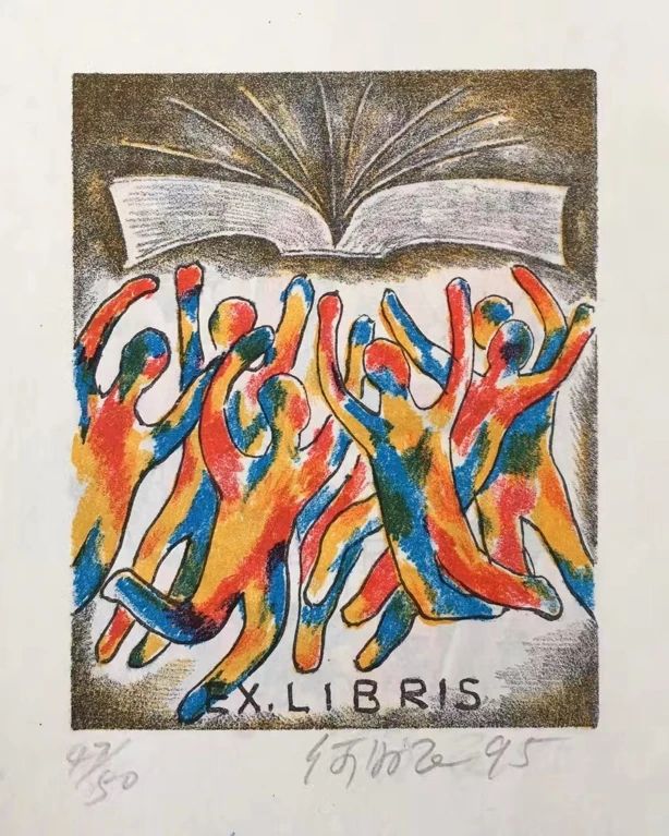 何為民創作的套色石版畫藏書票,該作品曾獲全國第六屆藏書票展銀獎。受訪者供圖