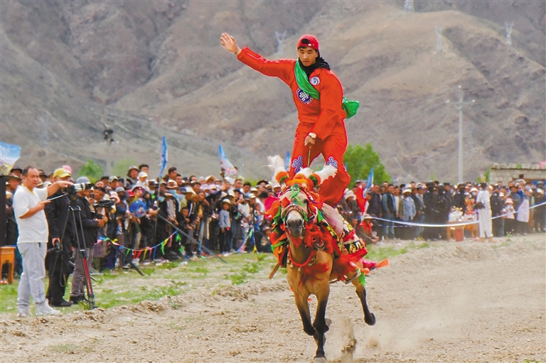 賽馬項目展示了非遺馬具、200米馬術比賽、短途沖刺賽、趣味挑戰賽等。騎手們緊握韁繩,揮舞著馬鞭,馬匹如離弦之箭飛馳而出,每一個高難度動作,都讓觀眾心跳加速、熱血沸騰。