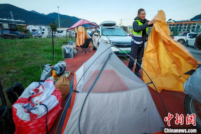 6月26日,摩旅理發師李秋實到達西藏林芝宇拓公園自駕露營地,搭建帳篷準備過夜。中新社記者 江飛波 攝