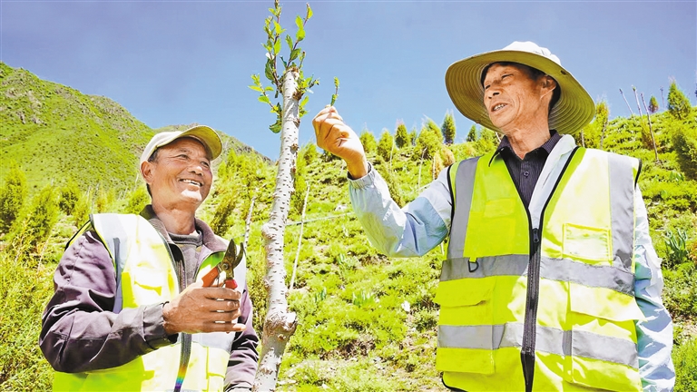 在2號片區,一支特殊養護隊伍映入眼簾。十幾位藏族村民在技術員的指導下修剪枝條,掌握技術后將成為專業管護人員。村民的動作略顯生疏,但專注的神情流露出對樹苗的珍視。