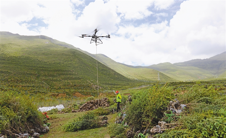 南北山綠化工程墨竹工卡縣段11號片區無人機在運送苗木。