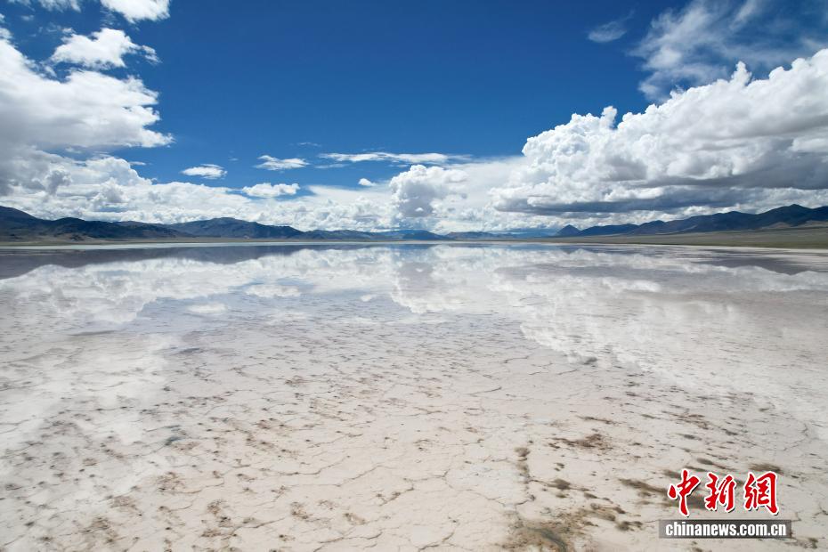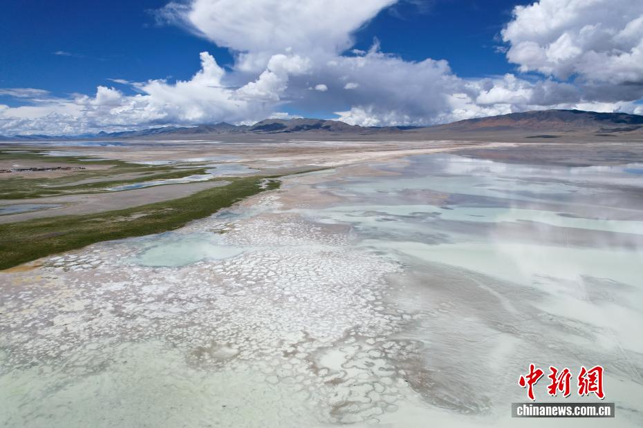 7月20日,航拍西藏阿里地區革吉縣鹽湖鄉境內的鹽湖。一千多年前,阿里地區有50多家駐扎的鹽幫,將自然鹽用羊馱牛背邊放牧邊運輸的方式,運送到普蘭、日喀則、印度、尼泊爾等地,并用以物易物的方式換回青稞、磚茶、布料等日常生活所需的物品,從而孕育了遠負盛名的“鹽羊古道”傳奇。近年來,當地開辦粗鹽巴加工廠、打造“鹽羊古道”旅游品牌等方式,使千年“鹽羊古道”煥發新生機。(無人機照片)中新社記者 張祥毅 攝
