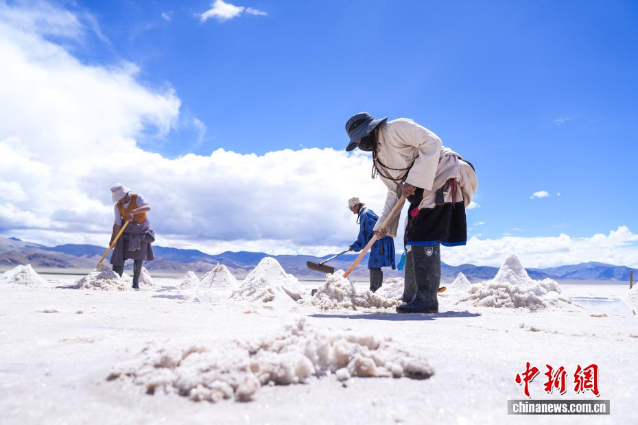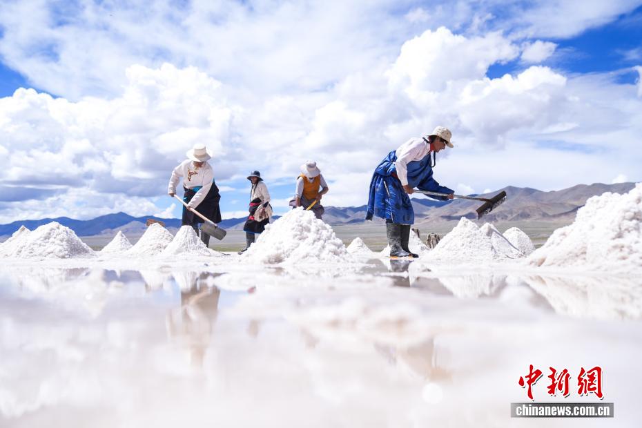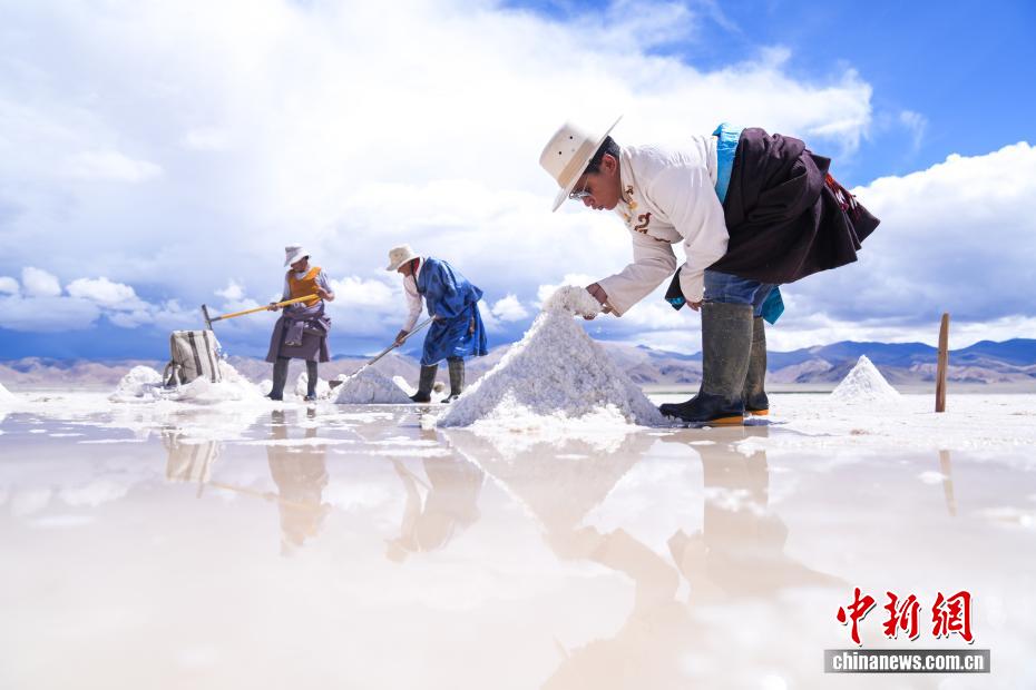 7月20日,在西藏阿里地區革吉縣鹽湖鄉,民眾在鹽湖中采制粗鹽巴。一千多年前,阿里地區有50多家駐扎的鹽幫,將自然鹽用羊馱牛背邊放牧邊運輸的方式,運送到普蘭、日喀則、印度、尼泊爾等地,并用以物易物的方式換回青稞、磚茶、布料等日常生活所需的物品,從而孕育了遠負盛名的“鹽羊古道”傳奇。近年來,當地開辦粗鹽巴加工廠、打造“鹽羊古道”旅游品牌等方式,使千年“鹽羊古道”煥發新生機。中新社記者 張祥毅 攝