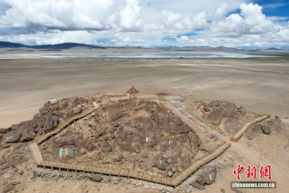 7月20日,在西藏阿里地區革吉縣鹽湖鄉拍攝的巖畫遺址公園,該遺址公園是“鹽羊古道”全域旅游景點之一。一千多年前,阿里地區有50多家駐扎的鹽幫,將自然鹽用羊馱牛背邊放牧邊運輸的方式,運送到普蘭、日喀則、印度、尼泊爾等地,并用以物易物的方式換回青稞、磚茶、布料等日常生活所需的物品,從而孕育了遠負盛名的“鹽羊古道”傳奇。近年來,當地開辦粗鹽巴加工廠、打造“鹽羊古道”旅游品牌等方式,使千年“鹽羊古道”煥發新生機。(無人機照片)中新社記者 張祥毅 攝